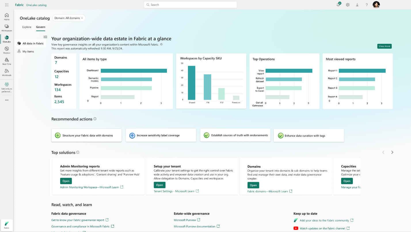 • Govern in OneLake voor tenant admins (preview): De OneLake-catalogus biedt nu een uitgebreide governance-ervaring speciaal voor Fabric-beheerders. Tenant admins kunnen in het Govern-tabblad alle gebruiksrapportages en aanbevelingen in één overzicht zien, met mogelijkheden voor cross-filtering en doorklikken. Via de Copilot-knop in dit dashboard kunnen beheerders in natuurlijke taal vragen stellen over hun data, trends ontdekken en snelle samenvattingen krijgen. Dit helpt om de data-governance en compliance binnen de organisatie effectiever te beheren.