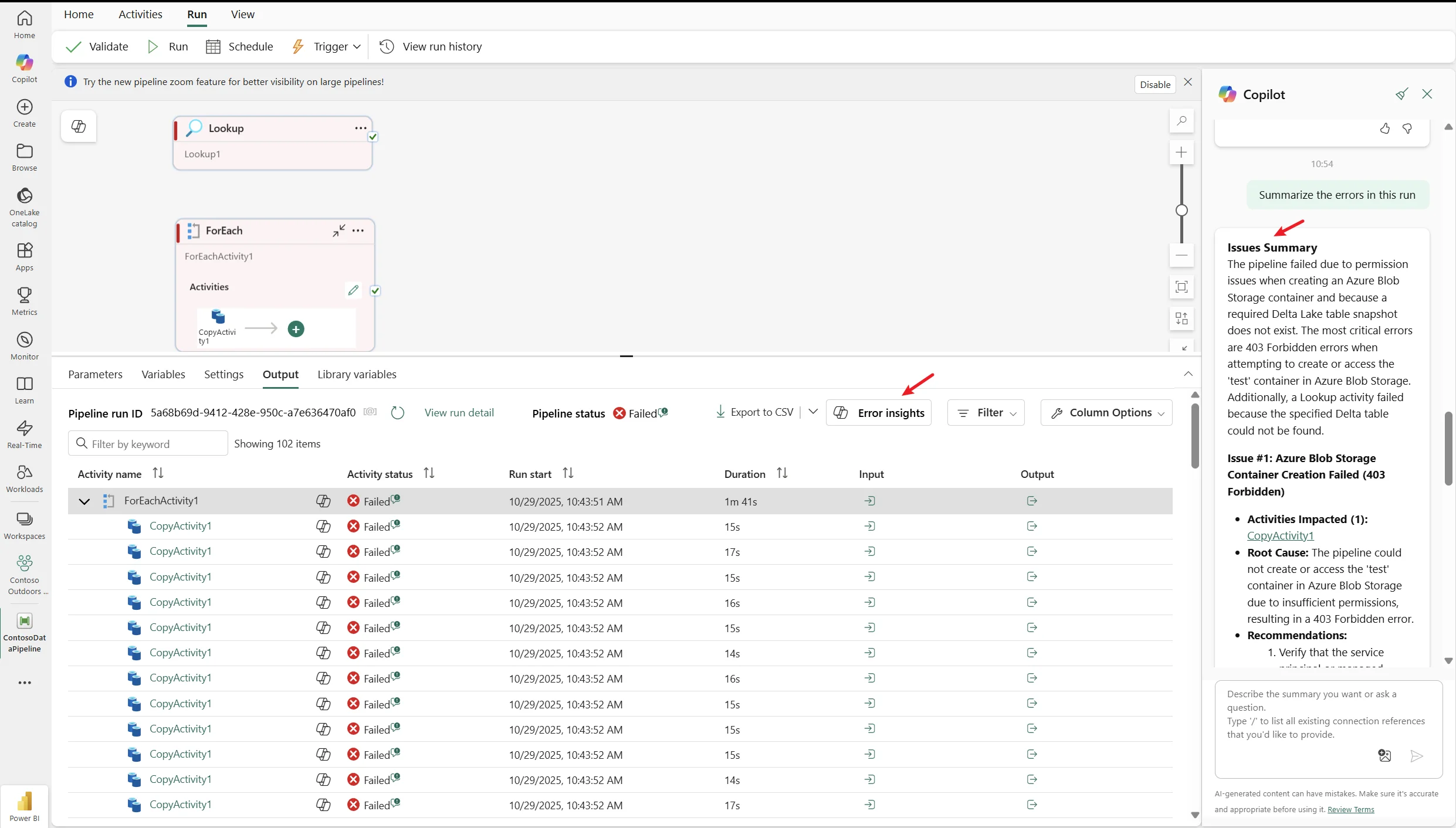 • Error Insights summary Copilot voor Pipeline: Het oplossen van pipeline-fouten is een stuk eenvoudiger geworden met de nieuwe Copilot-functionaliteit voor foutinzichten. Wanneer een pipeline-run faalt (soms met tientallen of honderden foutmeldingen), kun je nu in de Fabric Data Factory monitoring op "Error Insights" klikken. Copilot genereert dan automatisch een samenvatting van alle fouten in die run. In plaats van dat je elke error afzonderlijk moet nalopen, groepeert Copilot vergelijkbare errors, geeft per categorie een verklarende samenvatting van de oorzaak, en stelt gerichte oplossingsstappen voor. Dit bespaart enorm veel tijd en maakt het debuggen van complexe data workflows veel efficiënter.