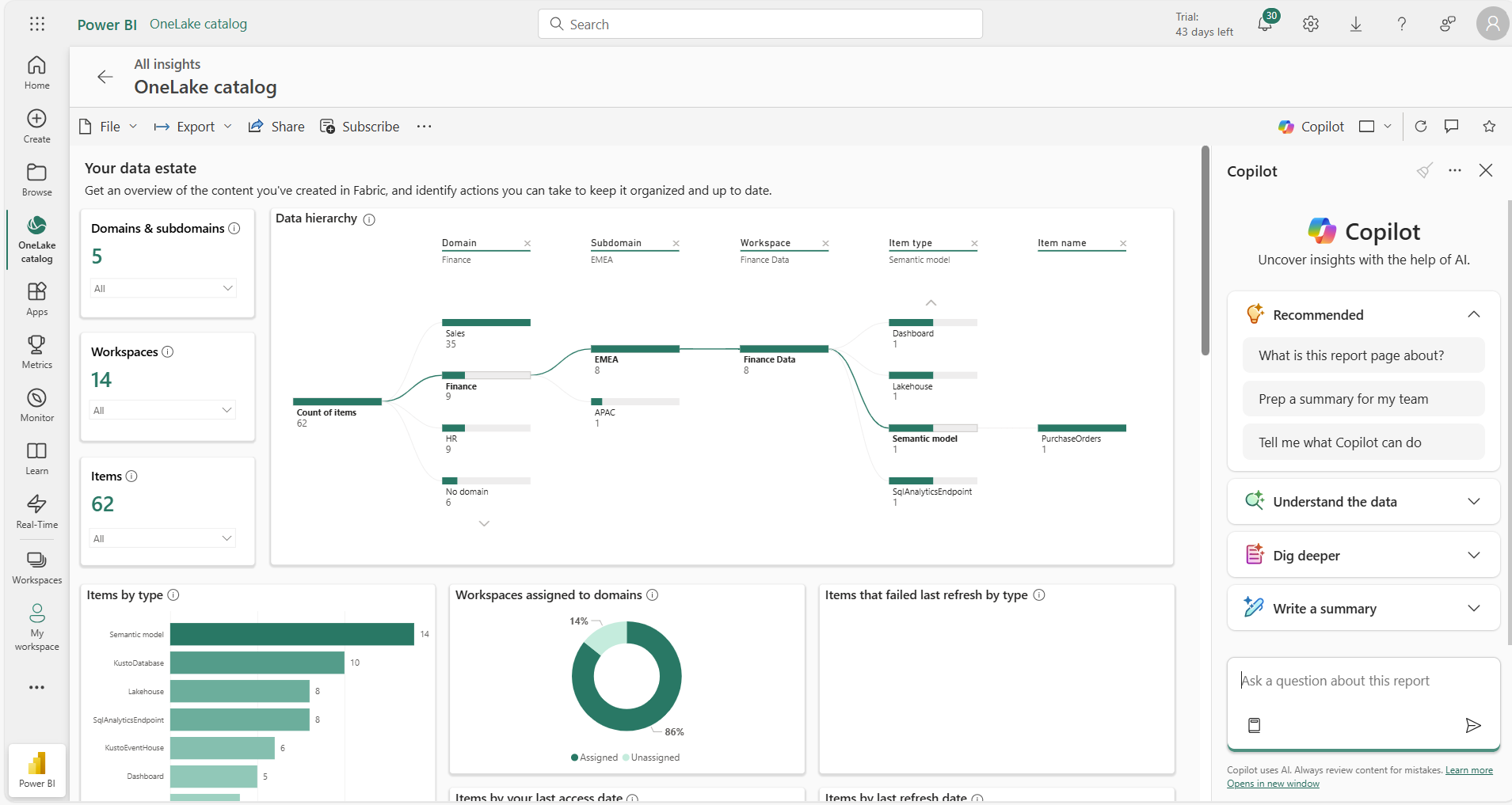 • Govern-tab in OneLake Catalog (algemeen beschikbaar): OneLake (de "OneDrive voor data" binnen Fabric) heeft nu een Govern-tabblad dat algemeen beschikbaar is. Deze biedt een hoogover overzicht van data governance in je Fabric-omgeving, met dashboards en inzichten over al je gegevensobjecten. Data-eigenaren krijgen hier aanbevelingen voor het verbeteren van governance en kunnen in één centrale plek zaken regelen als toegang, policies en beveiliging. Dit verhoogt de zichtbaarheid en controle over data, wat vooral nuttig is nu organisaties meer domain-based data governance willen invoeren.