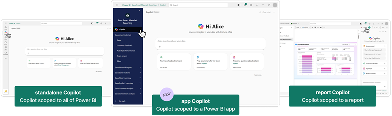 • Copilot in Power BI-apps (preview): Copilot is nu ook te vinden binnen Power BI Apps (gepubliceerde verzamelingen van dashboards/rapporten). Een App Copilot-knop bovenin de app-omgeving laat gebruikers zoeken naar rapporten in de app, vragen stellen en antwoorden krijgen op basis van de data in díe app. Deze Copilot op app-niveau is een aparte aanvulling op de al bestaande Copilot per rapport, en maakt het voor eindgebruikers nog gemakkelijker om inzichten te vinden binnen een verzameling van rapporten.