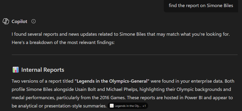 • Zoeken naar Power BI-rapporten in Microsoft 365: De zoekfuncties van Microsoft 365 (Office) en de M365 Copilot kunnen nu ook Power BI-rapporten en datasets terugvinden. Zoek je bijvoorbeeld in Office naar een rapporttitel, beschrijving of grafiektitel, dan verschijnen relevante Power BI-items direct in de resultaten. Zo kun je binnen je vertrouwde Microsoft 365-omgeving sneller de juiste rapportages vinden, zonder expliciet naar de Power BI-app te gaan.